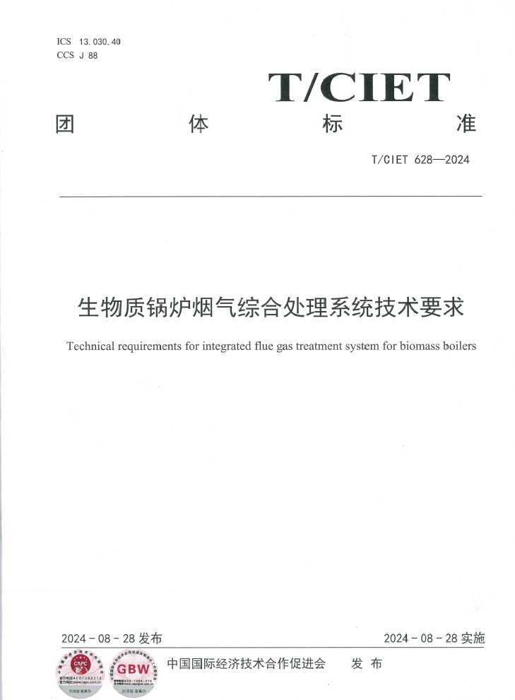在團(tuán)體標(biāo)準(zhǔn)制定期間,公司董事長高潔女士、公司總工嚴(yán)勇波先生共同參與了《生物質(zhì)鍋爐煙氣綜合處理系統(tǒng)技術(shù)要求》(標(biāo)準(zhǔn)號:T/CIET 628-2024)的前期討論和最終起草。