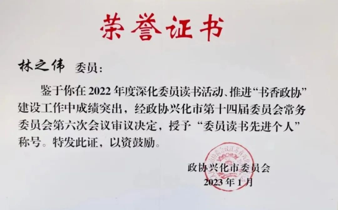 興化市政協(xié)組織和全體政協(xié)委員堅持以習近平新時代中國特色社會主義思想為指導,深入學習宣傳貫徹黨的二十大精神,為表彰先進,政協(xié)興化市委員會授予20名同志“委員讀書先進個人”榮譽稱號,我司運行總監(jiān)林子偉憑借在深化委員讀書活動、推進“書香政協(xié)”建設工作中的突出表現(xiàn)躋身其中。