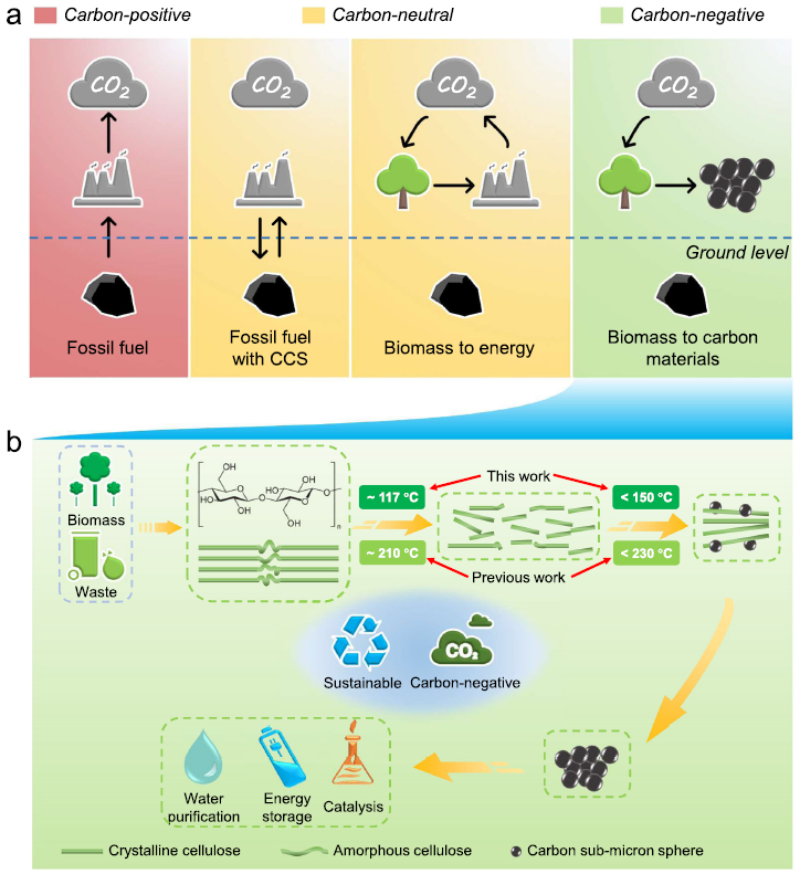 圖1.負(fù)碳排放的纖維素生成亞微米碳球示意圖