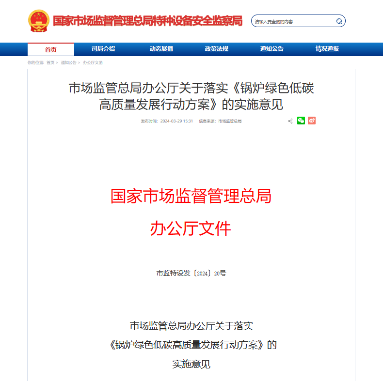 行業(yè)資訊|市場監(jiān)管總局辦公廳發(fā)布關(guān)于落實《鍋爐綠色低碳高質(zhì)量發(fā)展行動方案》的實施意見